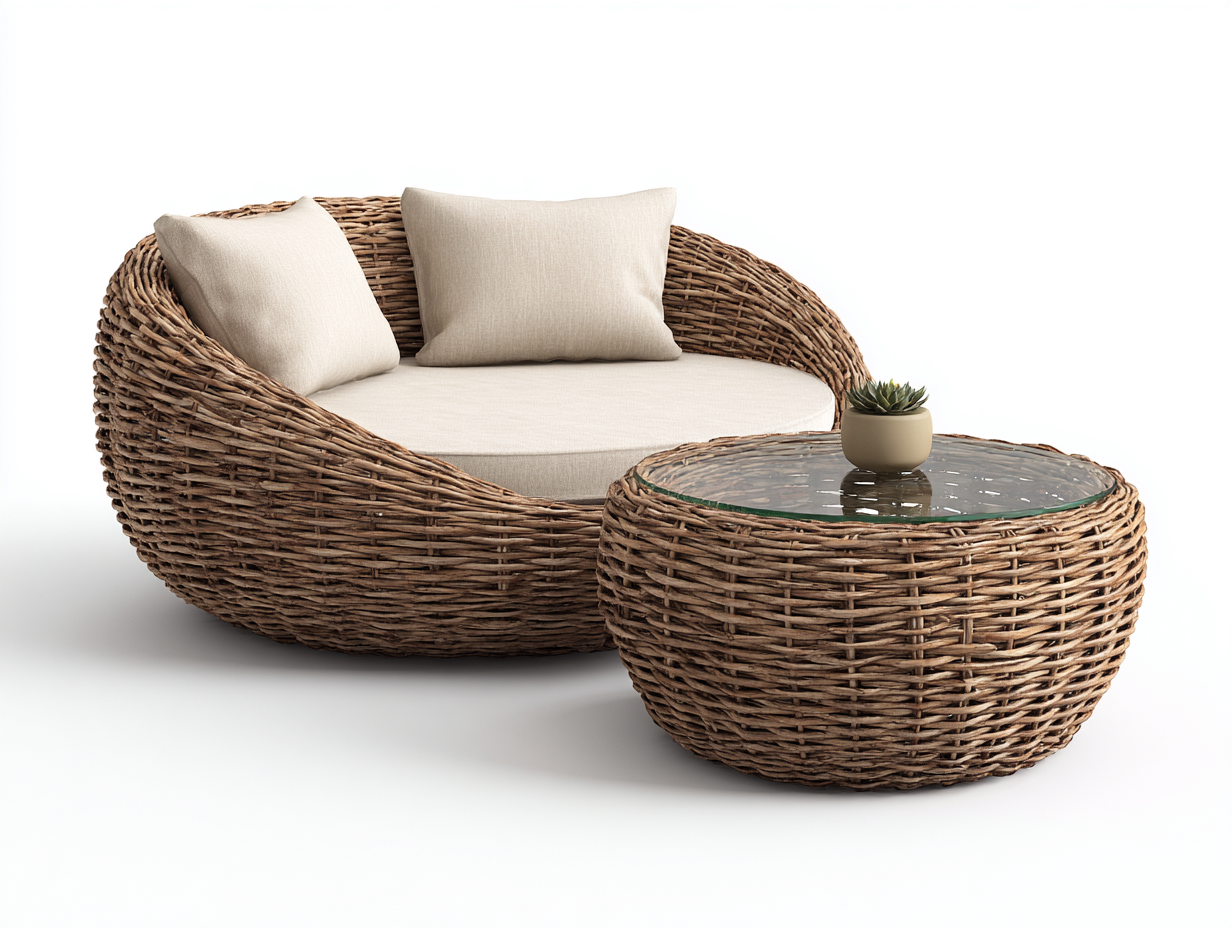 This outdoor sofa set is designed for relaxed seating in gardens, patios, and outdoor living areas. The rounded form and woven texture create a comfortable and inviting atmosphere suitable for leisure use.